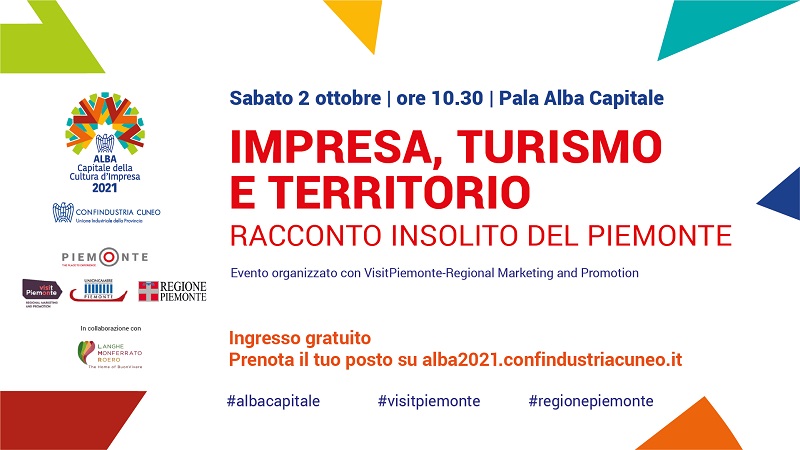 Si è svolta sabato 2 ottobre ad Alba, all’interno del calendario di “Alba Capitale della Cultura d’Impresa” organizzato da Confindustria Cuneo, la tavola rotonda “Impresa, Turismo e Territorio. Racconto insolito del Piemonte”, organizzata da VisitPiemonte. L’evento, moderato dalla Direttrice di Bell’Italia, ha previsto, dopo una introduzione istituzionale, un panel dedicato ai Musei d’Impresa con la partecipazione di Lavazza e Fondazione FILA, e uno dedicato agli imprenditori, con gli interventi dell’azienda vitivinicola Ceretto, di Tenuta Colombara-Riso Acquerello, del progetto “Gold Experience” di Valenza, del Borgo dei Formaggi-Occelli, del Gruppo Francoli di Ghemme. In questa occasione è stato anche presentato al pubblico il quinto videoclip mirato alla valorizzazione di specifici “prodotti” e attività del comparto MICE, dedicato al Turismo d’impresa e allo Shopping.
